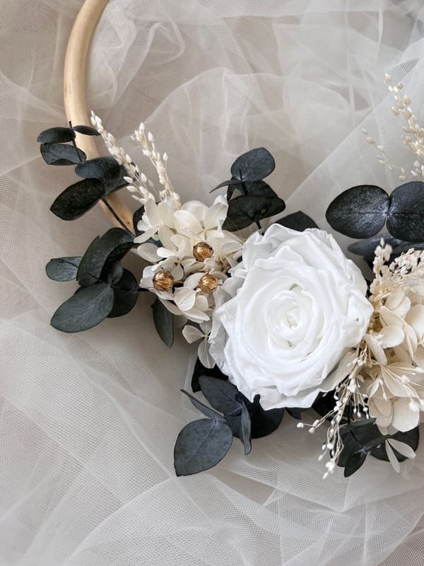 • Artisanat français et qualité : Chaque cerceau est assemblé à la main, garantissant la meilleure qualité et un soin particulier dans l’agencement des fleurs stabilisées.
