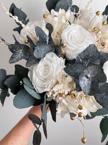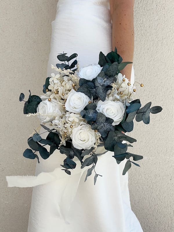 Choisir un bouquet de mariée rose blanche et eucalyptus stabilisé, c’est choisir l’intemporalité. Grâce à la stabilisation, votre bouquet ne fanera jamais et se transformera en un souvenir précieux que vous pourrez conserver et exposer chez vous.
