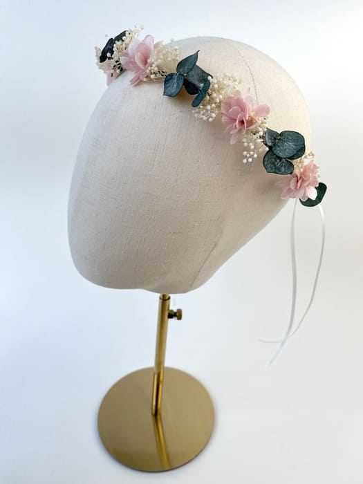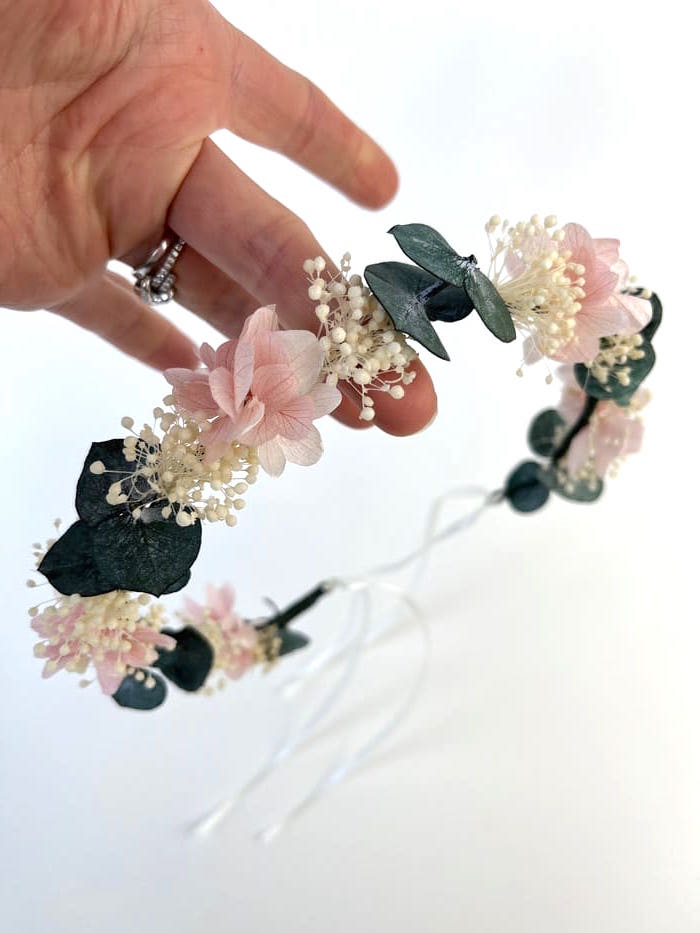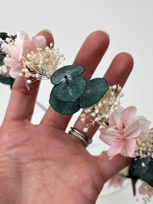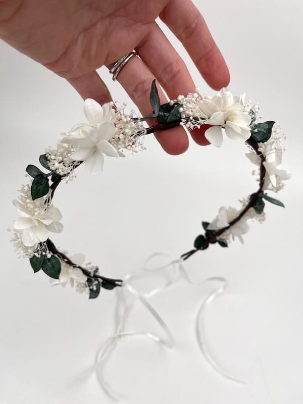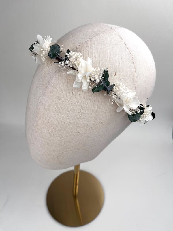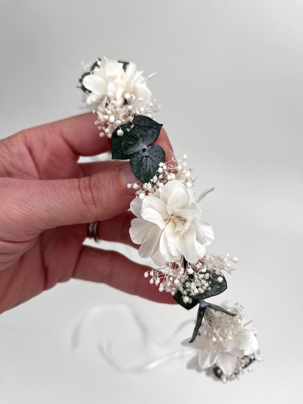 Ces fleurs principales sont magnifiées par le feuillage sombre et chic de l’eucalyptus stabilisé, qui apporte un contraste de couleur profond et moderne. Enfin, le mini gypsophile ivoire vient parfaire l’ensemble, offrant ces petites touches de lumière et de légèreté, évoquant la poésie d’une brume florale. L’association de ces matériaux nobles fait de la Demyrose l’accessoire couronne de fleurs mariage enfant rêvé.