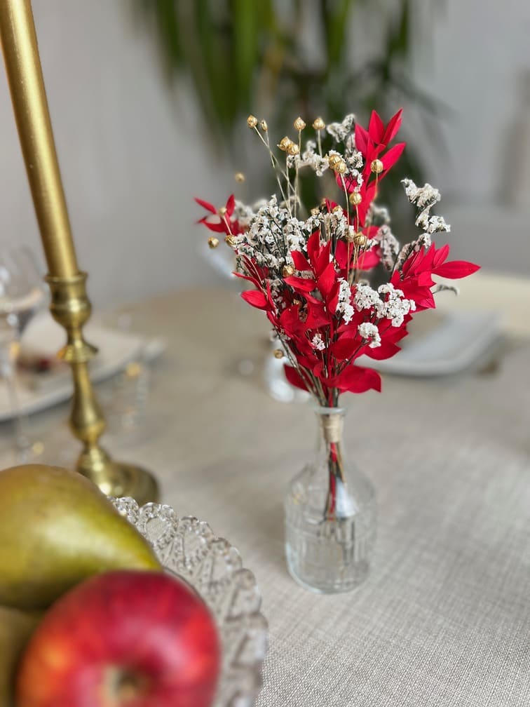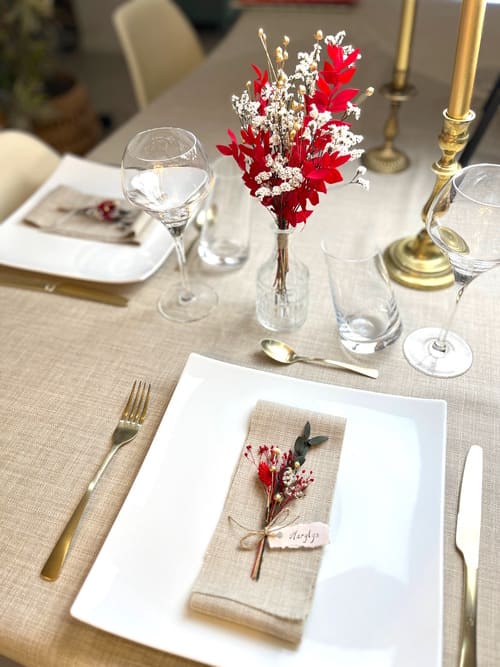 Pour une table de Noël parfaitement harmonisée, plusieurs mini bouquets peuvent créer un effet visuel spectaculaire. C’est pourquoi je propose des tarifs dégressifs pour l’achat de plusieurs bouquets identiques sans le vase. Que vous souhaitiez en placer deux sur une petite table ou trois sur une grande, le prix s’ajuste pour vous permettre d’embellir toute votre table sans compromis sur la qualité. Et si vous souhaitez varier les végétaux et les hauteurs, vous pouvez choisir parmi les autres bouquets proposés comme le bouquet fleurs séchées rouge et or Gaston ou le bouquet fleurs séchées rouge et blanc Anonciata.